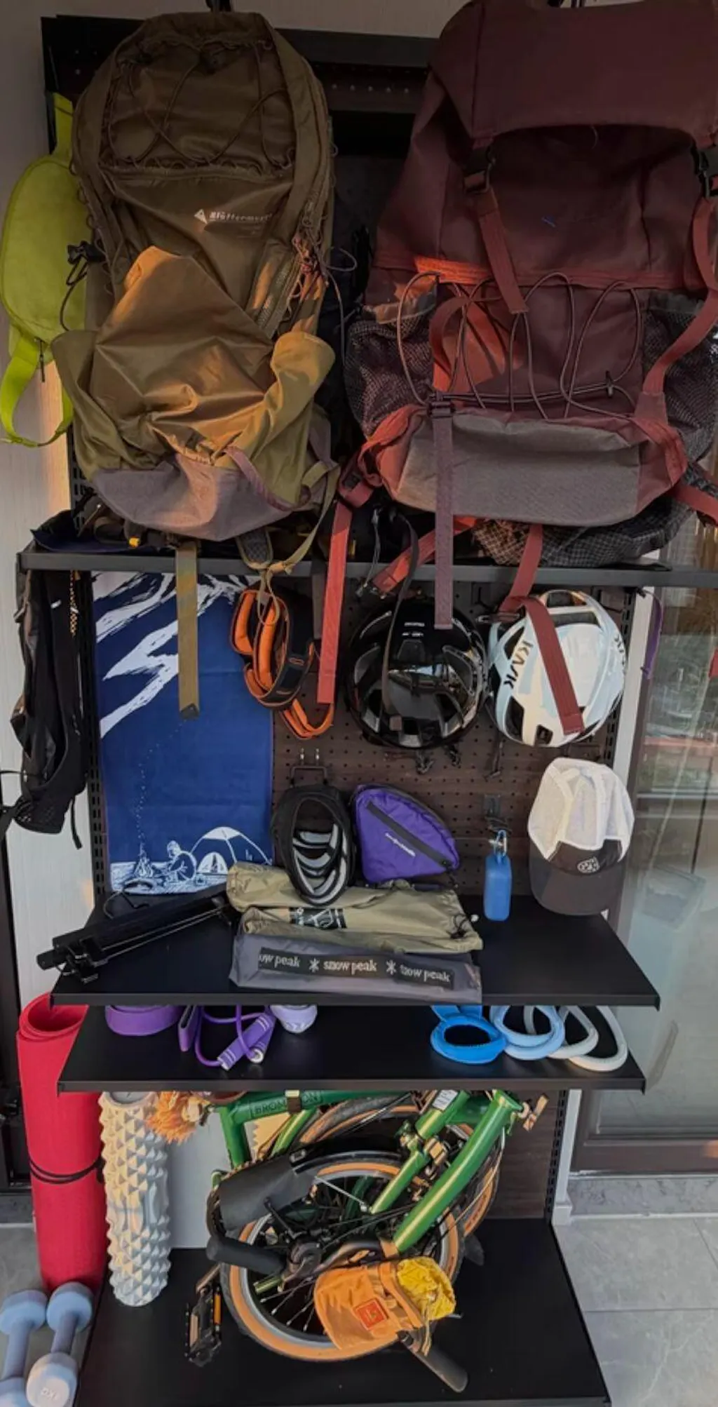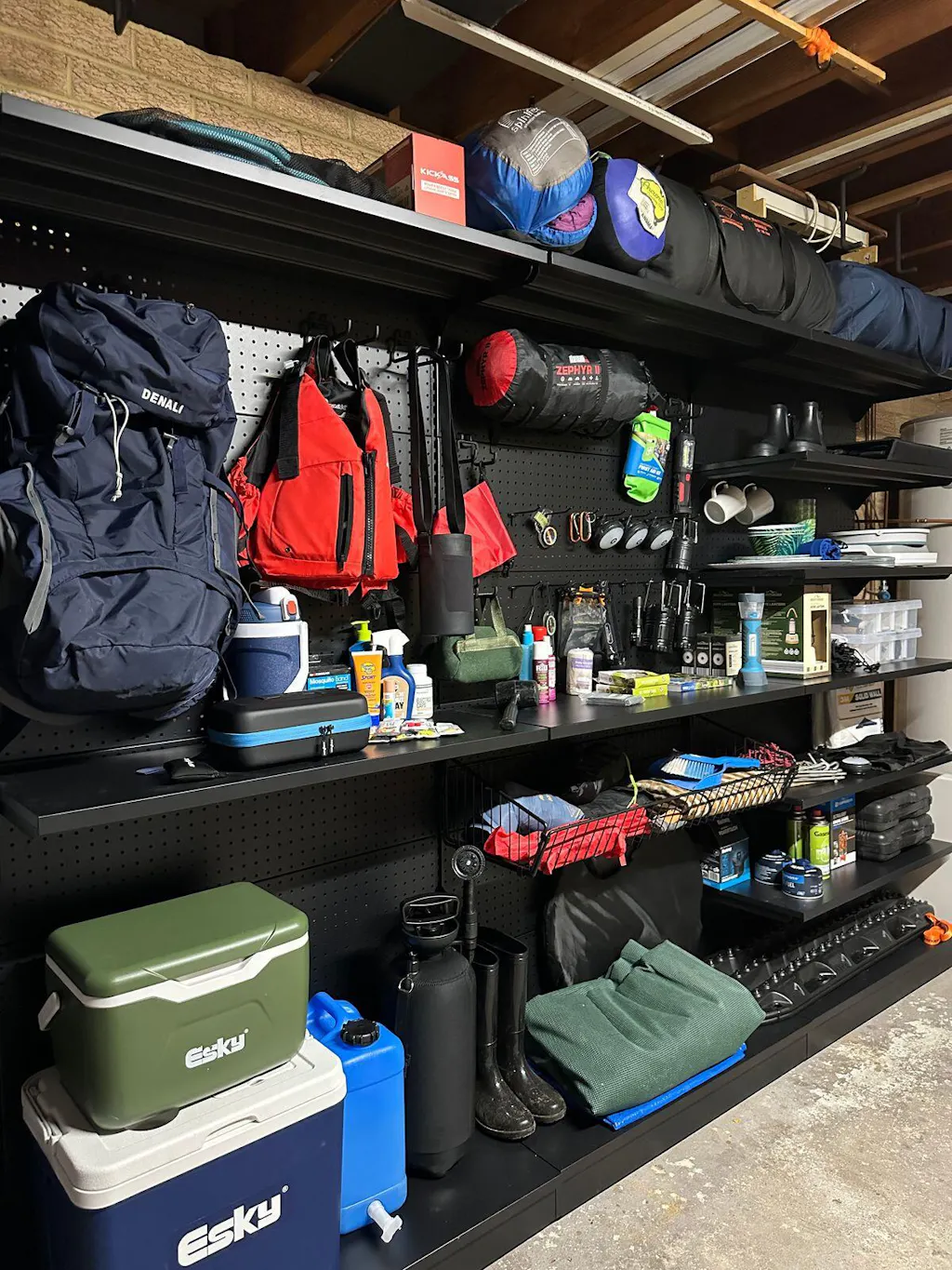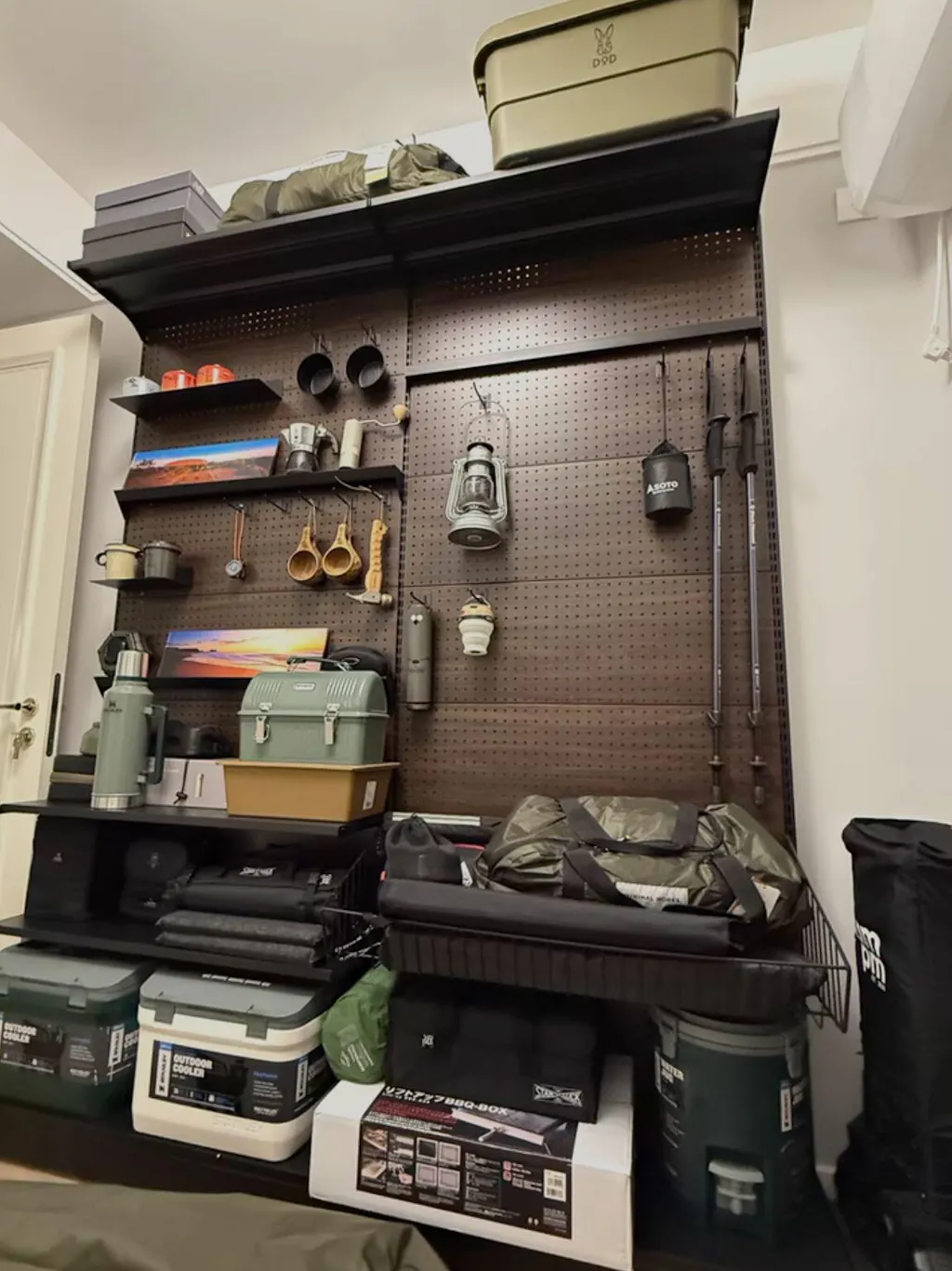 Got outdoor gear piling up everywhere? Camping gear in corners, tools mixed in, and nothing easy to grab when you need it. And drilling into walls isn’t an option.
